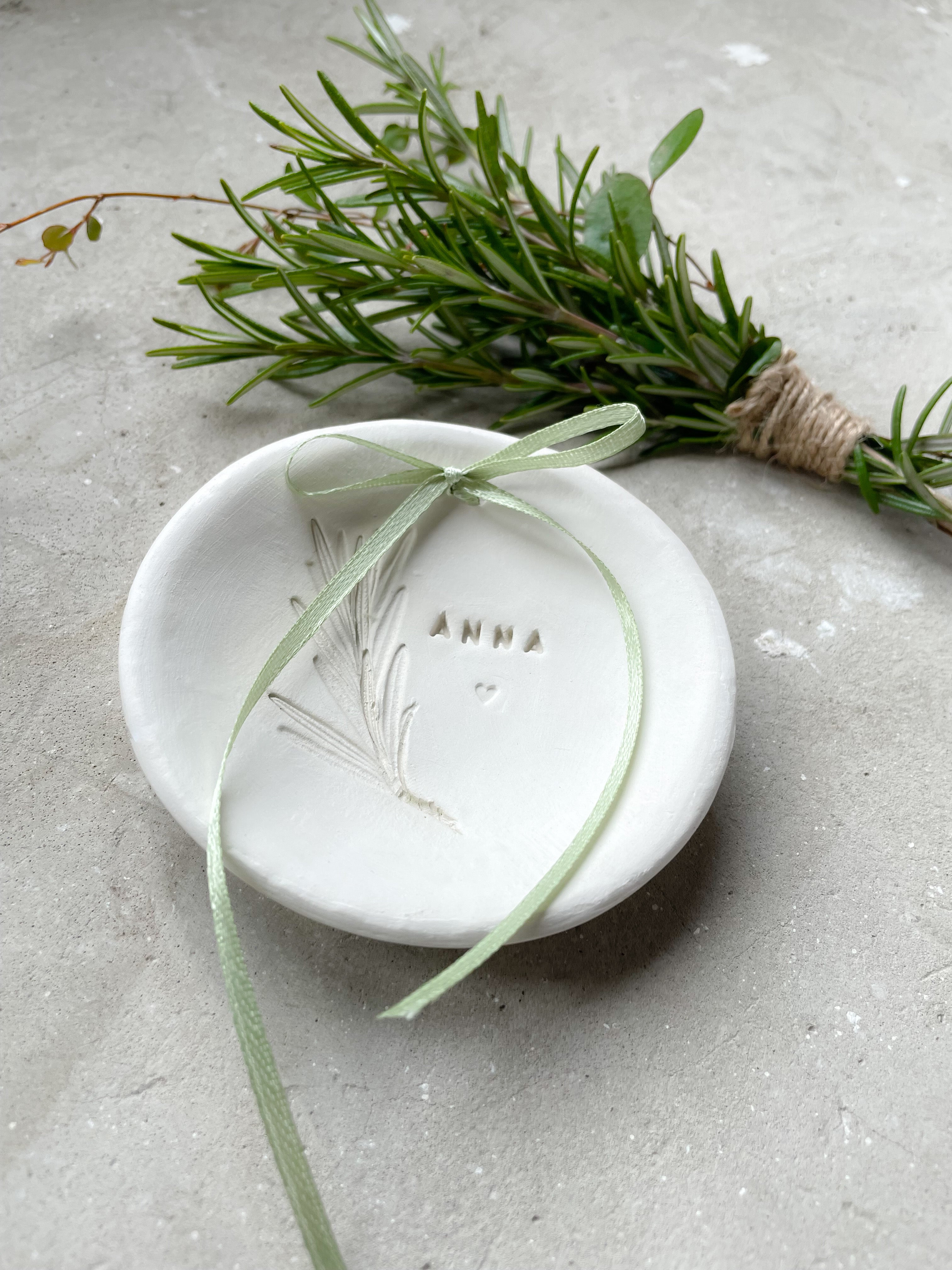 Handgefertigte Anhänger oder kleine Schalen aus Ton sind der Inbegriff des 2026er Trends. Während der Feier dienen sie als Platzkarten, danach begleiten sie deine Gäste als Schmuckablage oder Schlüsselanhänger nach Hause. Jedes Mal, wenn sie das Stück berühren, werden sie an das Gefühl deines Festes erinnert.